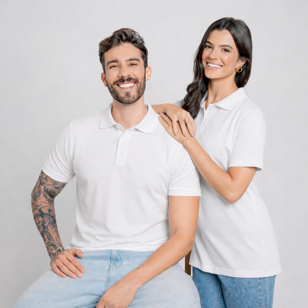 Camiseta polo unissex 50% algodão 50% poliéster – ideal para revenda, uniforme corporativo ou personalização.